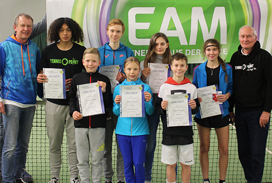 Die Sieger der nordhessischen Jugendtennismeisterschaften in Bergshausen mit von links (hinten): Matthew Zierenberg, Zoe Ströh, Emil Belz-Jurkovic, Elaph Kadhim, (vorn) Niklas Kretschmar, Pelin Sari, Anton Gorbatchev, Viktoria Jadwiszczok und Josef Ureche.